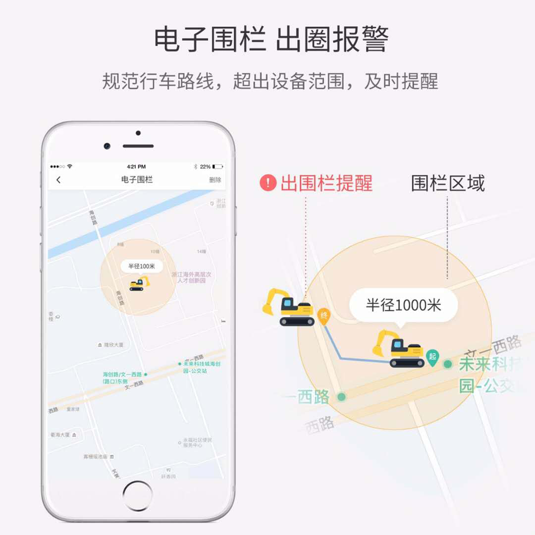 具有電子圍欄功能,出圈報警,協(xié)助挖友管理設備的行駛范圍,規(guī)范司機行車路線,當設備超出設定的工地范圍后,及時提醒。
