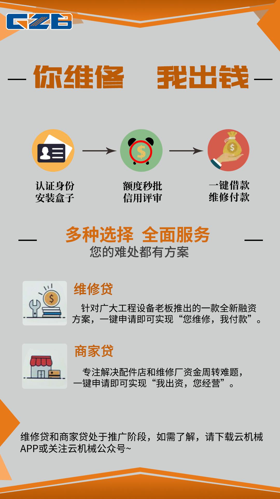 另外,云機械云盒根據(jù)不同的用戶,給予多種選擇。針對廣大挖機老板推出維修貸,一鍵申請即可實現(xiàn)“你維修,我出錢”。